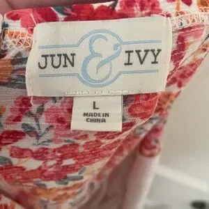 Vibrant floral dress with spaghetti straps. Features a mix of red, pink, and orange colors.