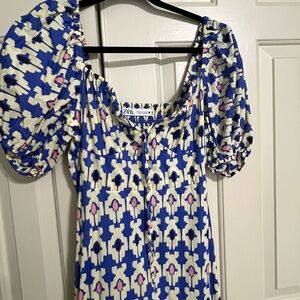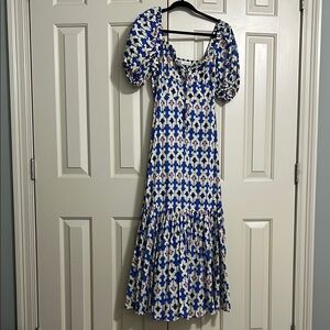 Elegant floral maxi dress with puff sleeves, perfect for any occasion. Features a vibrant blue and white pattern with hints of pink. Ideal for adding a touch of color to your wardrobe.