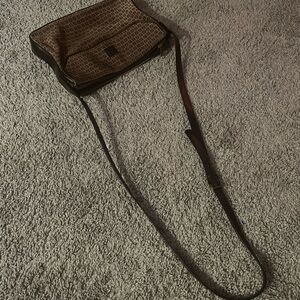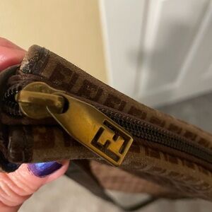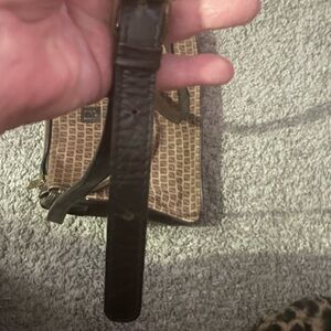 This Fendi crossbody bag showcases a sophisticated brown design with a distinctive geometric pattern, offering a timeless appeal. Crafted with durable materials and featuring a secure flap closure, it is perfect for both casual outings and formal occasions. The elegant contrast of darker brown leather trim adds a touch of luxury to this versatile accessory.purse has 3 compartments 2 compartments are flap close also( i replaced zipper that is the middle compartment) excellent condition 48” strap & has 3 more areas to go longer