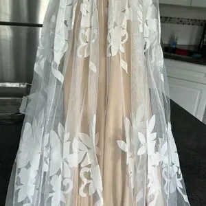 Beautiful lace over nude lining long maxi. Hidden zipper in back. Deep v-neck. Crisscross back. 100 percent polyester lining. Velvet flower detailing on lace overlay.