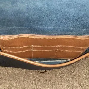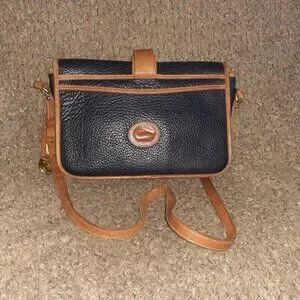 Up for sale is an authentic Dooney & Bourke Navy Blue/Tan Brown Equestrian Bag Flap Vintage Crossbody USA Leather. No tags so made in 1982-83...was authenticated on page 173 DB Purse Forum. Apparently it's a rare find