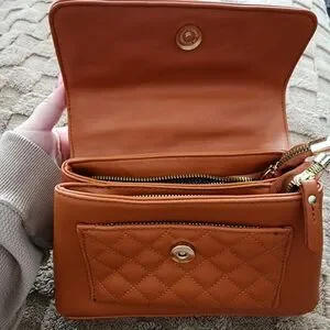 Crossbody purse with gold chain accent. Magnetic closure. 2 zipper pockets inside as well as a small pocket for cards. I never used it. Like new condition. The strap is lightweight. Unbranded.