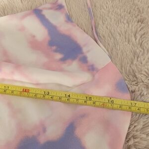 This vibrant Astr tie-dye pattern dress in pink and purple makes a perfect spring or summer outfit. It would be easy to dress up for a wedding or dress down with flat sandals for casual outings. The dress features a low cut back and a slit. The slit is 17" high. The dress is lined.