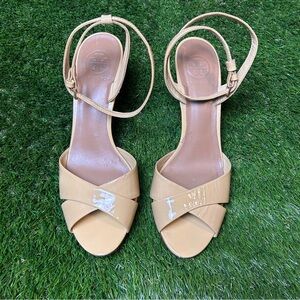 Tory Burch Patent Leather Tan Heels with Criss-Cross Straps, Size 9.5.