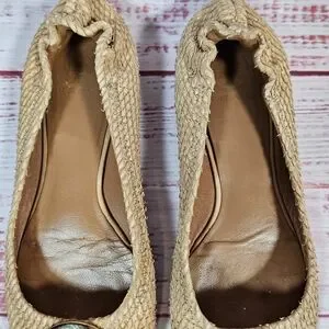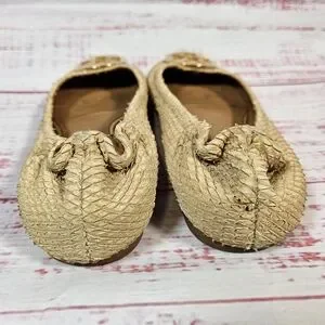 Tory Burch Reva snakeskin woven tan ballet slipper flats. Woven like texture. Elastic stretchy back. Tory Burch metal logo decals in front. Overall good used condition, some signs of wear in inner soles and on outer material.