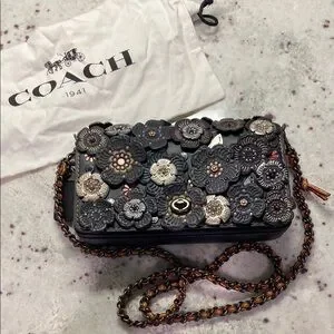 This black crossbody showcases a stunning floral pattern with intricate embellishments, offering a vintage charm. Its structured, rectangular design provides a formal and elegant appearance, making it a perfect accessory for special occasions.