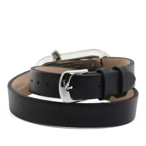 The Salvatore Ferragamo watch boasts a sleek silver case with a distinctive oval face, complemented by a wraparound black leather strap. Its minimalist design features a clean dial with slim black hands, offering a modern and elegant aesthetic.