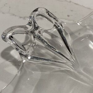 This beautiful, vintage serving plate was made by Fostoria Glass Co., measures 9.5in x 12in (including handles). Made of clear glass with unique butterfly/bow handles.