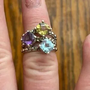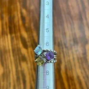 Jai beautiful sterling sliver ring deep purple amethyst, light blue topaz & citrine gemstones, all set in a beautifully intricate design. The clustered arrangement of stones creates a captivating and colorful piece, perfect for making a statement. Size 7