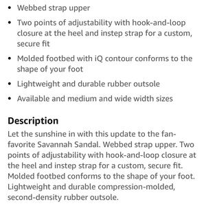 Style: sandal with 2 point adjustable hook and loop closure around ankle and toes/foot. Q contour footbed with arch support. Lightweight and durable.