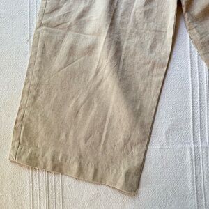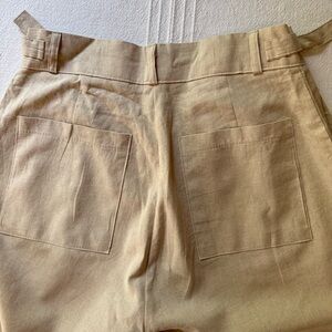 High-waisted, wide-leg summer pants in lightweight cotton khaki, small size. Features a front clasp closure and adjustable side buckles for a customizable fit and clean, tailored look. Worn once and in excellent condition.