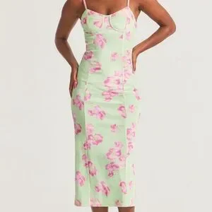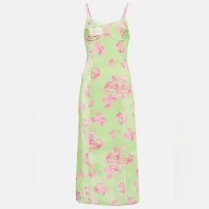 This elegant slip dress features a vibrant green base with pink floral patterns. Perfect for a stylish and comfortable look.