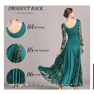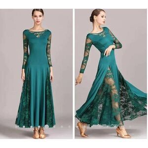 Long sleeve lace formal dress features lace inserts ..designed for Latin dancers