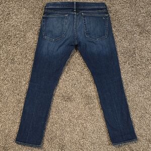 These rag & bone jeans feature a classic indigo blue color with a straight leg. The distressed design at the knees adds a contemporary touch to the traditional denim look, making them perfect for casual outings.
