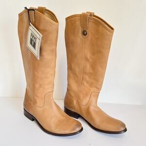 These NEW Frye Melissa Button Leather Tall Boots in a rich tan hue exude timeless style. Crafted from high-quality leather, they feature distinctive button pull tabs for easy on and off. The classic round toe completes the iconic Frye silhouette of these tall boots. These are new with tags! NOTE: this came from a smoking home so the boots do have a smokey smell to them.