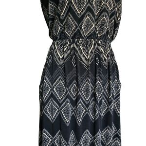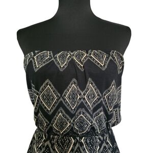 This elegant strapless maxi dress features a chic black and white geometric pattern. Perfect for any occasion, it offers a stylish and comfortable fit.