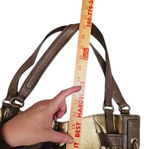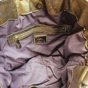 This Kooba gold and brown leather bag boasts a luxurious metallic finish, blending elegance and functionality. The spacious interior features multiple compartments for organized storage, while the strap provides versatile carrying options. With its sophisticated design, this bag is both a practical accessory and a statement piece.