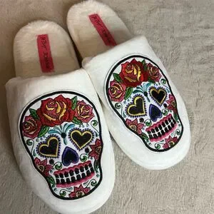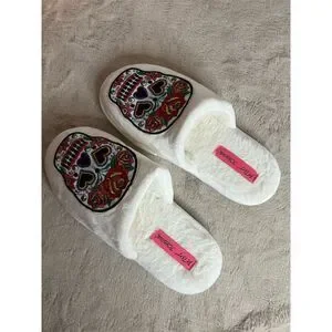 Indulge in the vibrant charm of Betsey Johnson's white slippers, designed to bring a playful twist to your casual moments. These women's slippers feature a delightful sugar skull theme with intricate embroidery, adding a splash of personality to your loungewear. The plush lining cradles your feet in warmth and comfort, while the non-slip rubber sole ensures stability with every step. Slip them on effortlessly and enjoy a cozy fit that makes relaxation a stylish affair. Perfect for unwinding at home, these slippers are brand new.