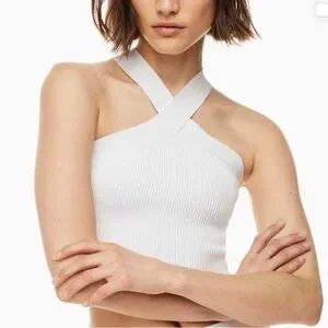 Elevate your style with this chic white halter neck ribbed top. Perfect for any occasion, it offers a sleek and modern look.