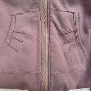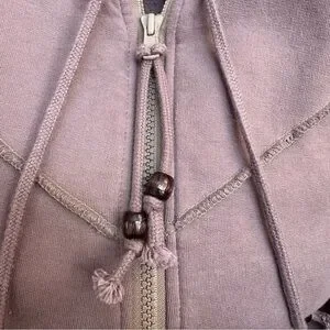 This Prairie Underground hoodie jacket is a beautifully unique piece with a soft, dusty purple tone and signature raw-edge seams. Features a full zip front, flattering seamed construction, cozy hood with wooden bead ties, and front patch pockets with artistic stitching. A standout layering piece with an effortlessly cool, modern-boho vibe.