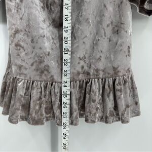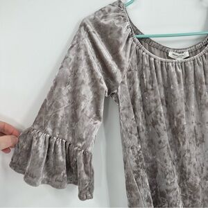 This is a Beach Lunch Lounge Sheetal Velour Velvet Top in size XS. The top features an off-the-shoulder neckline, 3/4 bell sleeves, and a relaxed fit. Made of polyester and spandex, the top is machine washable and has ruffle accents. It is perfect for travel, parties, or casual wear during the winter, fall, or spring seasons with its stretch fabric. The top has a solid gray Champagne color and a basic style with a beach theme.