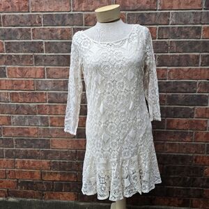 Free People Walking to the Sun Cream Lace Mini Dress Size 10 Boho Drop Waist