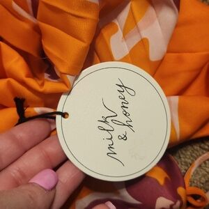 NWT size small Milk & Honey floral maxi dress- orange/purple/light pink/white . pleated bottom. expandable criss cross straps. small side opening on chest ( see pics) pleated, flowy bottom. perfect for wedding or event.