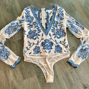 Elegant bodysuit with blue floral embroidery. Features long sleeves and a deep V-neckline.
