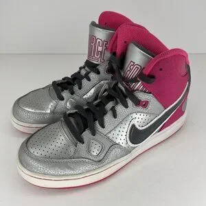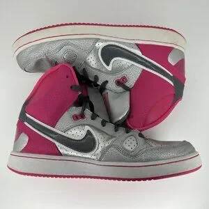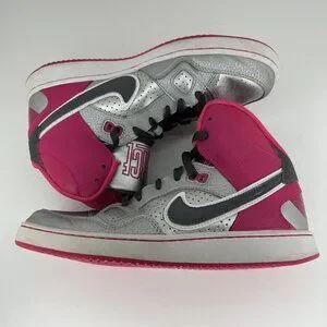Elevate your child's sneaker game with these Nike Son of Force high-top junior sneakers. The silver pink colorway adds a fun pop to any outfit, while the synthetic materials provide durability and comfort. These athletic sneakers feature a lace-up closure and standard shoe width for a secure fit, making them perfect for both basketball and everyday wear. The flat heel height ensures ease of movement, and the rubber outsole offers great traction for any surface. Ideal for all seasons, these sneakers are a must-have for any trendy kid's shoe collection.