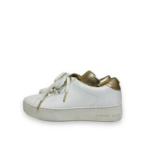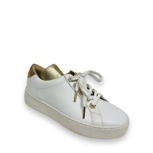 This MICHAEL KORS White Gold Leather Irving Floral Accent Logo Lace Up Sneakers 6.5 effortlessly combine sporty style with a touch of feminine elegance. Made from smooth white and gold leather, they feature delicate floral details and the iconic Michael Kors logo, offering a chic and versatile option for casual wear.