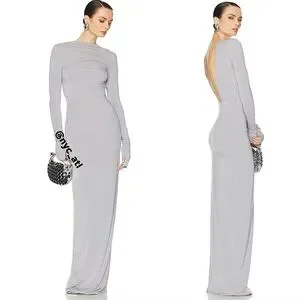 This elegant gray dress features a sophisticated long sleeve design, perfect for any formal occasion. The sleek silhouette and open back add a touch of glamour.