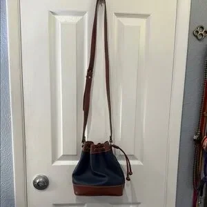 Elevate your style with this esprit bucket bag. Crafted in a chic hunter green and brown leather combination, it's perfect for any occasion. The adjustable strap offers versatile wear. Slight stain shown in pic