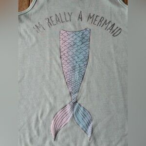 Tank top from Kensie Girl. Size medium 10/12. Light green tank top with “I’m Really A Mermaid” in silver glitter and mermaid tail. Longer on sides. 100% polyester. Very good used condition.