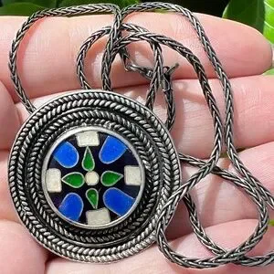 STUNNING ONE OF A KIND NECKLACE WITH LARGE ROUND PENDANT ADORNED WITH VIVID COLORS BLUE / GREEN INLAID GEMSTONES SUSPENDED ON A VERY NICE WHEAT LOOKING CHAIN. BOTH PENDANT AND CHAIN ARE STERLING SILVER, BOTH STAMPED AND BOTH ALSO HAVE BEEN TESTED. THE CHAIN IS ALSO HALLMARKED “ ITALY”. BOTH ITEMS ARE DONE IN SORT OF “BLACKISH” OXIDIZED STERLING SILVER. I AM UNSURE IF THIS CHAIN IS ORIGINAL TO THE PENDANT OR PREVIOUS OWNER MADE SUCH A AMAZING MATCH, BUT I WILL NOT SEPARATE, SOLD AS A GORGEOUS SET ONLY !!! THE CHAIN IS APPROXIMATELY 17” LONG.