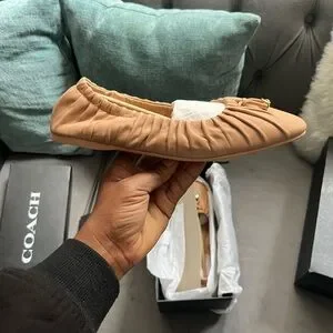 Coach Tan Flats with Ruched Leather and Bow Detail