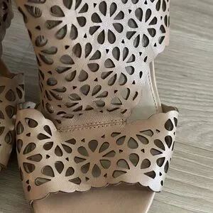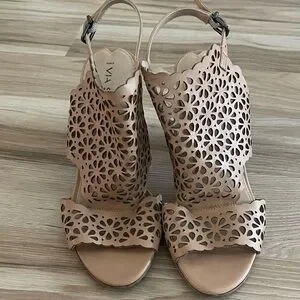 Elegant tan heeled sandals with intricate cut-out design. Adjustable ankle strap. Perfect for any occasion.