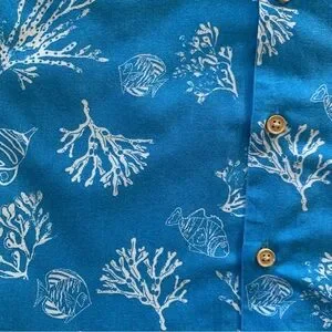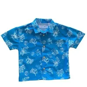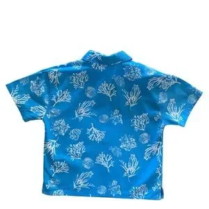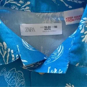 ZARA Baby Boy Blue White Button Down Shirt 100% Cotton Shirt Sleeve Fish Coral Beach Ocean Sea Vacation Travel Size 18-24 Months