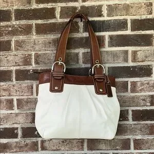 Elevate your style with this elegant Coach tote bag. Crafted in luxurious white and brown leather, it's perfect for any occasion. The spacious interior and sturdy handles make it both fashionable and functional.