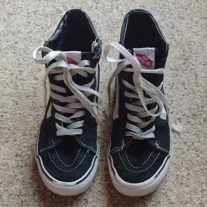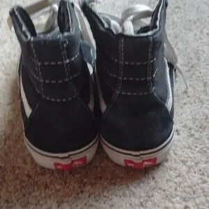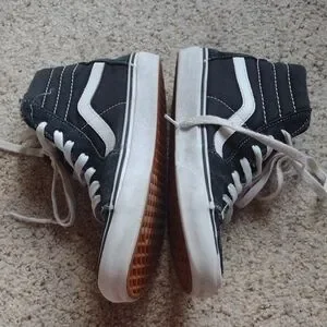 Stylish black high-top sneakers with white laces. Perfect for casual wear. Can be women's or men's. Women's size 7.5 and men's size 6. In good condition however a dog did chew the top part of the high top where you can see I. pictures but it honestly gives it a vintage look.