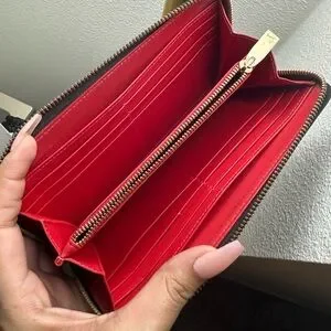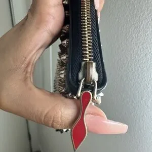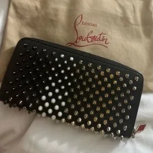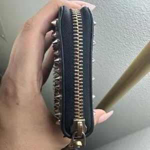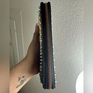 Stylish black wallet with black, silver and gold studs. Some studs peeled, see pictures. Leather has no rubbing.