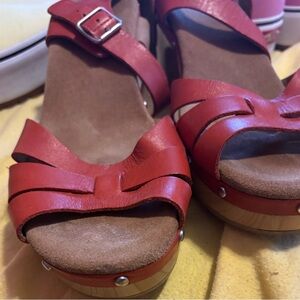 Step into style with these Clarks red sandals, featuring a chic woven leather pattern and a secure ankle strap and cushioned footbed for a comfortable fit. Perfect for both casual and sophisticated occasions, these sandals offer a modern twist on a classic summer look.