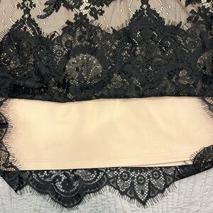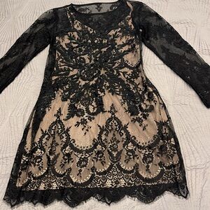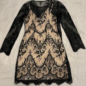 Express Women’s Black Lace w beading and tan tank liner dress size 6