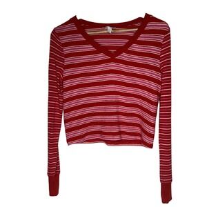 Colsie Small Lightweight Knitted Top Red Pink Striped Long Sleeves Crop VNeck