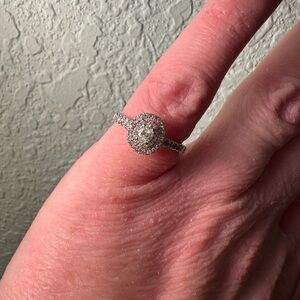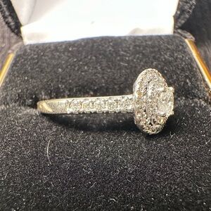 Beautiful 1/5 ct oval center stone surrounded by a double halo of round diamonds with diamonds adorning the band. Set in 14K white gold (markings were removed when sized). US size 7. Beautiful tiny diamonds sparkle on the undercarriage.