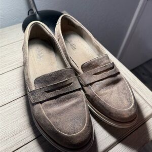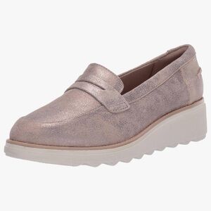 Clarks Women's Sharon Ranch Penny Loafer in good condition. Experience the perfect blend of style and comfort with Clarks flats. These shoes feature a sleek slip-on design with a cushioned footbed, making them ideal for everyday wear. The metallic finish adds a touch of elegance to any casual outfit.