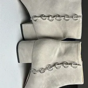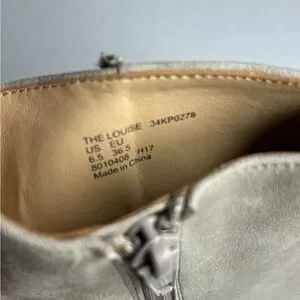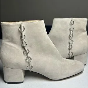 These chic ankle booties from Katy Perry Collections feature a sleek cream suede finish and a comfortable block heel. The modern silhouette and rounded toe make them a versatile addition to any wardrobe, perfect for elevating your style with a touch of elegance.