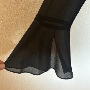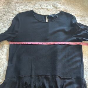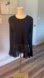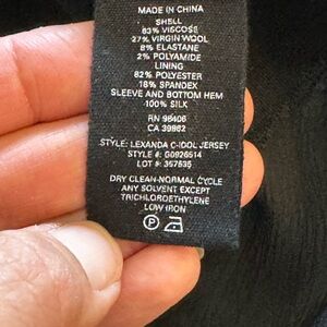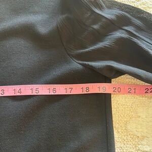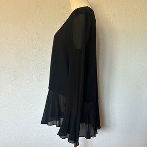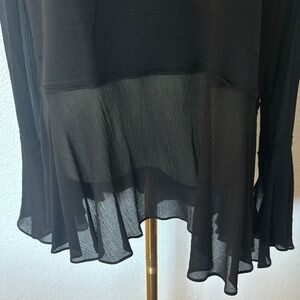 This black wool blend top with silk chiffon accents adds a touch of sophistication to your wardrobe. Features crew neck, keyhole back with button loop closure, and long flared sleeves. Worn once so condition is used excellent/like new.