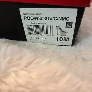 Add a burst of color to your ensemble with our Rainbow-308UV Sandals. The eye-catching 7-inch heel and 2 3/4-inch platform glow with a spectrum of neon colors when under UV light, creating a stand-out effect. Paired with sleek clear straps, these sandals offer a dazzling aesthetic that complements a variety of outfits and occasions, lighting up any venue with a playful charm.