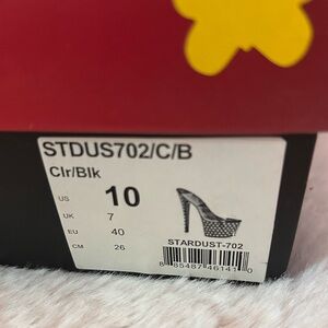 Step into the spotlight with the Stardust-702 slides. These eye-catching slides feature a dazzling 7-inch heel complemented by a rhinestone-studded 2 3/4-inch platform that sparkles with every step. Designed with a sleek clear/black color scheme, these slides are crafted for those who love to stand out. Whether it's for a special occasion or a regular night out, the Stardust-702 adds a glamorous touch to any ensemble.