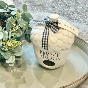 Charming Rae Dunn acorn decor. Features 'KNOCK' text. Topped with a black and white checkered bow.